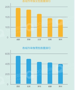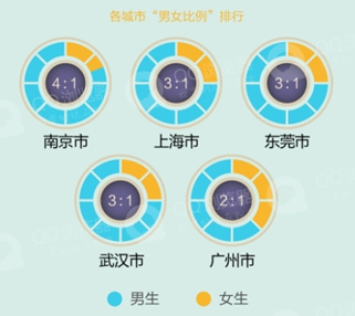 从人数上看,成都、西安、北京的单身妹子领先全国,而单身男性最多的城市依次为西安、北京和深圳。南京虽然男女光棍数量均未进前五,但男女比例竟然高达4比1!上海、东莞和武汉的男性也不好过,3比1的男女比,同城资源紧缺!想找妹子还是放眼全国,组团去成都吧!