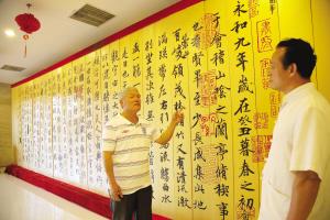 制作匾额时,蒋玉麟需要先在木头上铺上复写纸,将字体拓印到上面,“别看是拓印,也要求懂书法。尤其是面对名家的字时,只有自己懂,才能领会出字里的神韵,否则只是形似而无神,糟践了好的书法作品。在雕刻过程中,只有心里有底,才能刀下有根。”也正是因为如此,蒋玉麟开始苦练书法。如今,他不仅创作了神形兼备的巨幅作品《兰亭序》,还自创了新风格的纹理书法——在这类作品中,字的每一笔都像一幅画。