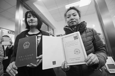 昨天上午,北京天街集团有限公司代表(图右)和市民闫女士(图左)来到东城区不动产登记事务中心,分别领取了本市第一、第二本不动产权证书。从今日起,全市16个区县将全面启动新的不动产登记簿证。本报记者 孙戉摄