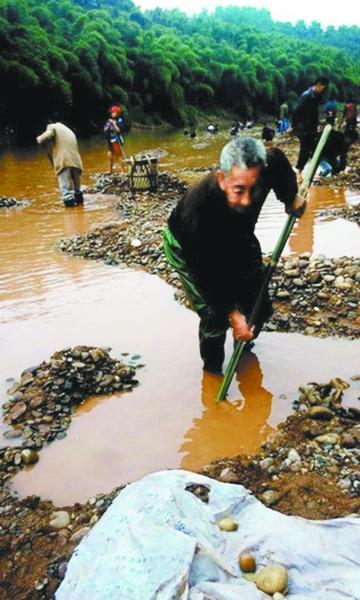 记者在南滩镇捡石河滩现场见到:四五十个村民正在用铁锹把水中的鹅卵石撮起来用流水澄清。当地村民饶跃斌介绍,此地名叫洗猪滩,南滩河里有一种石头,用矿灯照后竟然能透光,“一般的鹅卵石不能透光,这种石头不仅能透光,上面还有桂花一样的花纹”。饶跃斌花100元买了一条橡胶裤和一把铁锹,每天都会到河滩上挖几个小时的石头。