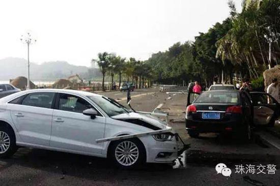 民警在现场了解到,一辆奥迪小车沿情侣路吉大往香洲方向行驶,行驶到海霞新村路段时,车辆突然失控,撞坏了设在道路中间的10多米护栏,径直冲到了对向车道。面对突如其来的奥迪小车,正在对向车道正常行驶的4辆小车完全来不及作出反应,眨眼之间就“躺枪”了,有的与这辆奥迪小车发生了刮擦,有的被撞坏的护栏刮到。
