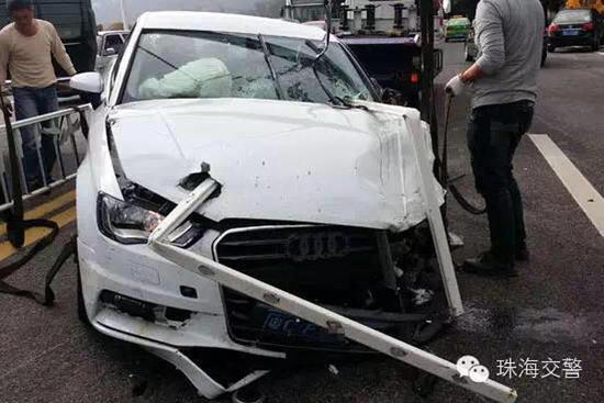 民警在现场了解到,一辆奥迪小车沿情侣路吉大往香洲方向行驶,行驶到海霞新村路段时,车辆突然失控,撞坏了设在道路中间的10多米护栏,径直冲到了对向车道!面对突如其来的奥迪小车,正在对向车道正常行驶的4辆小车完全来不及作出反应,眨眼之间就“躺枪”了,有的与这辆奥迪小车发生了刮擦,有的被撞坏的护栏刮到。