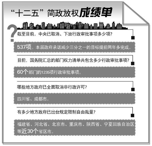 两年多来,简政放权、放管结合工作取得明显成效。据统计,迄今为止,国务院部门共取消或下放行政审批事项537项,本届政府承诺减少三分之一的目标提前两年多完成。