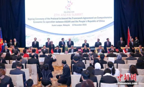 当地时间11月22日下午,李克强在吉隆坡国际会议中心同东盟10国领导人共同见证标志着中国—东盟自贸区升级谈判全面结束的成果文件—《中华人民共和国与东南亚国家联盟关于修订<中国 —东盟全面经济合作框架协议>及项下部分协议的议定书》签字仪式。 中新社记者 刘震 摄