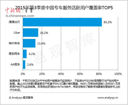 中新网11月24日电 第三方研究机构易观智库近日发布了《2015年第3季度中国专车服务市场监测报告》,数据显示2015年第3季度,滴滴出行、Uber和神州专车分别以83.2%、16.2%和13.4%的比例占据中国专车服务活跃用户覆盖率的前三名。