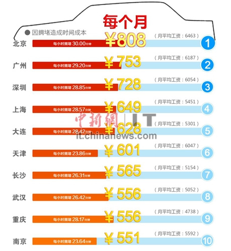 本季交通报告中,高德还发布了通勤族因拥堵造成的时间成本榜。在榜单中,不见首堵济南的身影,位居榜单前列的却是北京、广州、深圳、上海。王宇静解释,该榜单是根据本季度各城市因拥堵造成的时间成本换算而来。例如,本季度北京的高峰拥堵延时指数是2.0,则意味着北京通勤族高峰每出行1小时,就有30分钟耗费在严重堵车上。根据社保部门最近公布的上年度平均工资,将时间换算成金钱的话,北京通勤族每月因拥堵造成的时间成本就有808元(按每月22个工作日,每天通勤2小时计算)。通过该榜单可以说明,经济越发达、基本工资越高的城市,因拥堵造成的损失越大。