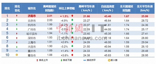 中新网11月25日电 11月24日,高德发布了《2015年第三季度中国主要城市交通分析报告》。报告显示,本季度济南超越北京,拥堵排名由上季度第四飙升至第一,成为全国最拥堵的城市。而其它国内十大堵城依次为北京、杭州、广州、哈尔滨、深圳、上海、大连、重庆、青岛,其中青岛为首次入榜。环比上季,本季福州拥堵加剧排名第一,北京拥堵缓解最大。