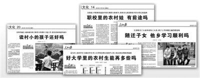 黄:农村孩子最欠缺的是均等的受教育机会、公平的教育资源配置,“末端补偿”不如“源头扶持”。城镇化的进程加速,教育资源随着人口迁徙而转移,教育资源除了向农村倾斜,是否还应考虑向城市里的农村孩子倾斜?改善农民工子弟学校的办学条件,让他们也能分到一点城市教育的优质资源。提高职业院校的办学质量,提高农村孩子的劳动技能、文化水平,让他们的就业渠道更宽广。