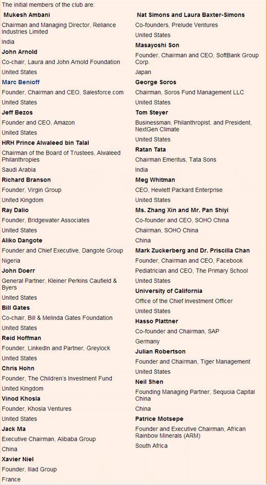 在这张已曝光的名单中可以看到亚马逊创始人兼CEO杰夫·贝佐斯、惠普总裁兼CEO梅格·惠特曼、Facebook联合创始人马克·扎克伯格等人,成员涉及十个国家。四位中国企业家在列:阿里巴巴集团董事局主席马云、红杉资本创始合伙人沈南鹏、SOHO中国董事长潘石屹及夫人张欣。所有成员的集体财富超过上千亿美元。