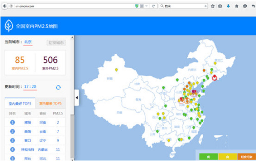 豹米联合多家空气净化器厂商发布中国室内空气质量地图数据,数据统计了全国各个城市室内室外的PM2.5数值和排名情况。用户可以直接选择自己所在城市查看室内室外PM2.5数据,决定出行计划。数据显示,12月1日17:20分,北京室外PM2.5数值仍然爆表,达到506,而室内PM2.5数据则较为乐观,达到85。这种天气显然适合室内活动。