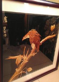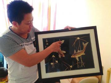 但杨碧云最自信的是,碳化出来的玉米秆是不会褪色的,虽然耗费精力,但是效果很好,比如老鹰羽毛、鱼的鳞片等细节部分,看起来都是那么栩栩如生。这样的画作,因为材质取自纯天然的植物,加上后期消毒处理,存放几百近千年都是不会变的。