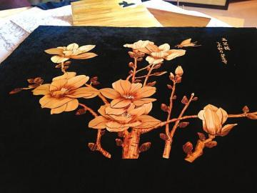 描摹到玉米秆上,也只是中间的一个插曲。真正体现画作的立体感,还需要由里到外的层次。杨碧云介绍,例如一朵玉兰花,描摹到玉米秆上后,还要用剪刀将每一朵花瓣、每一个枝条剪下来,逐个用电烙铁上色。花朵所处的位置不同,受光影响的色彩也是不同的。