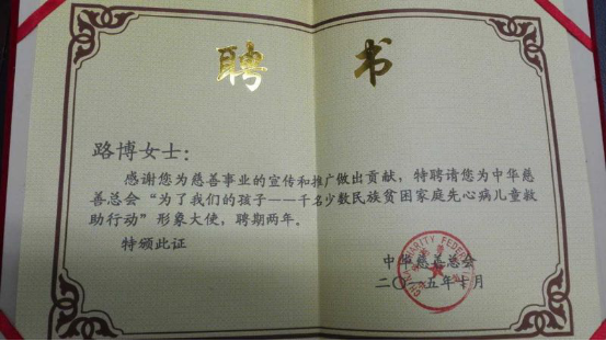 2015首届中华慈善之夜慈善晚会近日在北京鸟巢文化中心落下帷幕。中央电视台著名节目主持人路博、姚雪松、杨柳爱心主持,全国各地数百位爱心企业家、艺术家和社会各界爱心人士积极支持和热情参与,因长期关注支持慈善,同时也为2015中华慈善之夜作出了很大贡献,中华慈善总会授予中央电视台著名节目主持人路博“为了我们的孩子——千名少数民族贫困家庭先心病儿童救助行动”形象大使称号。据了解,首届中华慈善之夜由国家发改委主管、国家信息中心主办的《财经界》杂志社主办,中华慈善总会将作为此次慈善活动所筹集善款的接受方。中华慈善总会、国家信息中心相关领导出席活动并致辞。