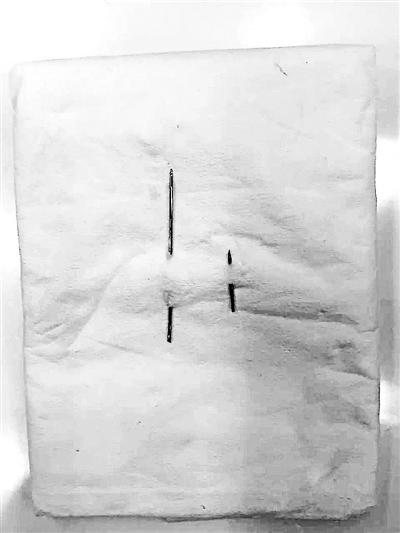 父亲:扎进去以后,光凭针眼你是看不出具体位置在哪儿的,针在体内是到处游走的,因为两根针都是带着针尖。那根长针取出来的时候,皮肤就顶开得很高,你可以想像这个针扎进去的时候难度是很大的,所以你想想这个人心有多狠。