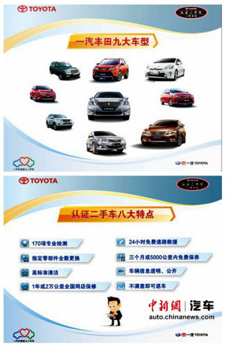 一汽丰田发展二手车业务十年来,在全国已有76家认证二手车销售店,并设立了北京、大连、珠海、宁波、郑州、沈阳、中山、佛山等9个二手车中心,认证二手车累计销量达到11000台。