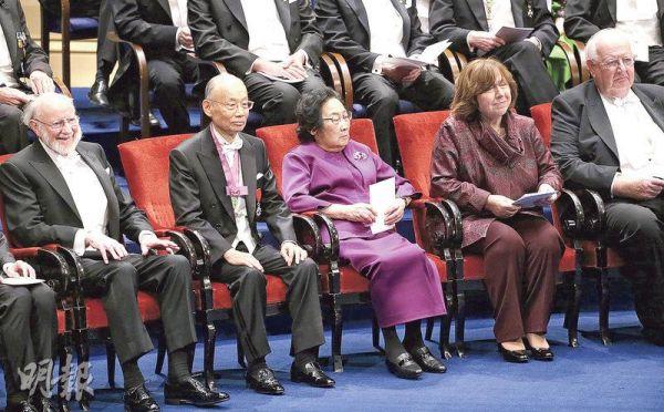 84岁高龄的屠呦呦(中)因身体不适缺席两项公开活动,在颁奖典礼上,坐在她旁边的是另一名得奖者、日本化学家大村智(左二)。(新华社)