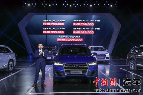 一汽-大众奥迪销售事业部执行副总经理葛树文先生宣布全新奥迪Q7作为首款第四代豪华SUV正式上市并公布价格中新网12月4日电 3日,以全新设计理念开发,搭载奥迪前沿科技的豪华C级SUV--全新奥迪Q7正式上市,共推出40 TFSI(2.0T)和 45TFSI(3.0T)两个排量共5款车型。其中40 TFSI 舒适型 75.38万元,40 TFSI S-Line运动型 79.88万元;45 TFSI 技术型85.58万元,45 TFSI S-Line运动型92.98万元,45 TFSI 尊贵型109.88万元。