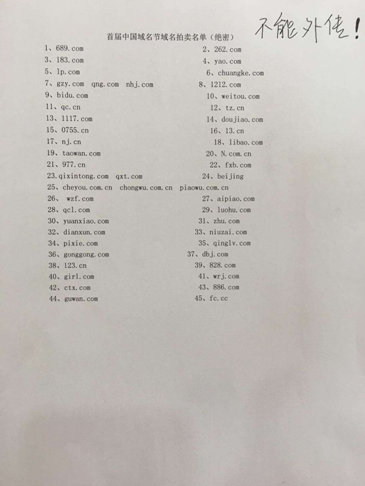 记者联系到首届“中国域名节”组委会工作人员,一名程姓工作人员看到记者出示的“名单”大为吃惊,她表示这份名单内容基本属实,但该名单在正式拍卖环节之前属于“绝密”,领导还特意在上面手写了“不能外传”的字样,得知名单外泄领导震怒,表示要彻查外泄“内鬼”严肃处理,同时,这份意外外泄的名单也可能会做适当调整。