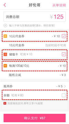 以好伦哥为例,在消费买单时,统一支付入口将原本百度糯米专有的代金券、储值卡支付通道统一到到店付这一接口中。