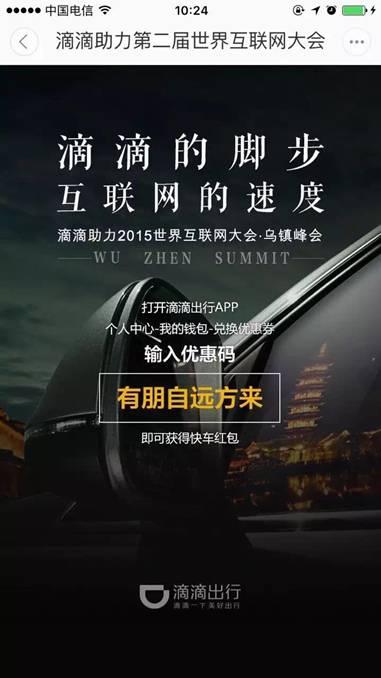 为了表示对参加本届大会的2000多位领导人和嘉宾的欢迎,大会期间,只要打开滴滴出行APP,就会看到滴滴特意准备的海报弹窗,引用孔子《论语》中的经典名句“有朋自远方来”,滴滴还把这句古语设置成了最受用户喜欢的打车红包,只要在滴滴APP“我的钱包”中输入“有朋自远方来”六个字,就能获得滴滴快车优惠券。