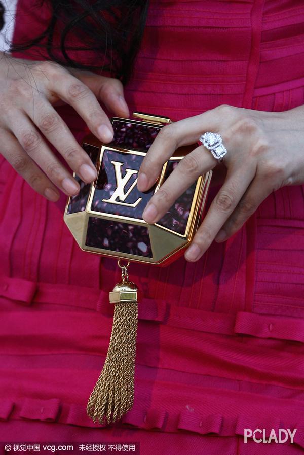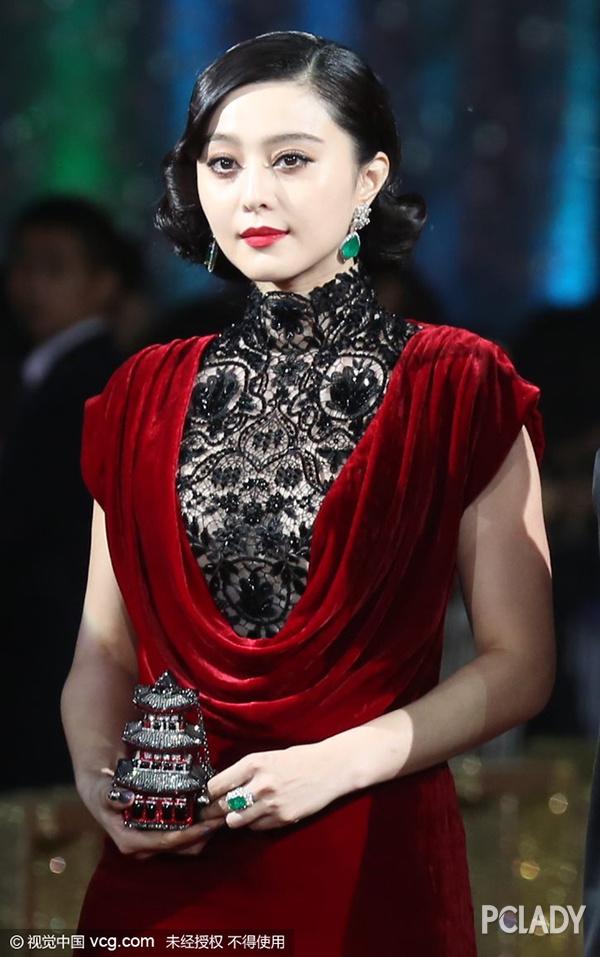 天鹅绒、祖母绿、黑蕾丝,这些古典元素在范冰冰身上显得如此和谐、美妙、婀娜。手拿塔行金属材质包袋,尽显优雅。