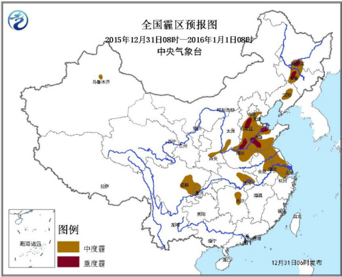 12月31日08时至1月1日08时,北京南部、天津西部、河北中南部、河南中北部、山东西北部和南部、山西南部、陕西关中、黑龙江南部、吉林中部、辽宁中部、四川盆地中西部、江苏大部、上海、湖北中东部等地的部分地区有中度霾,其中,河北中南部、河南北部、山东西北部、吉林中部局地有重度霾。中央气象台12月31日06时继续发布霾黄色预警。