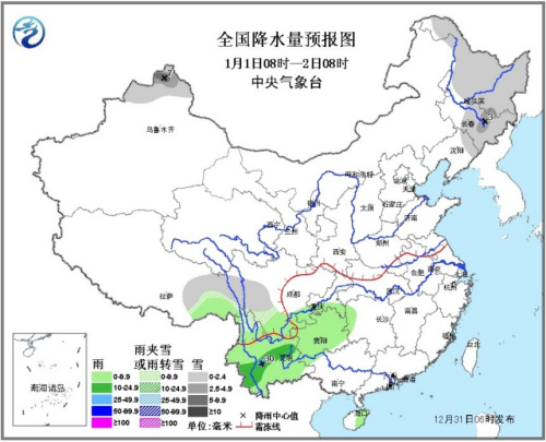 1月1日08时至2日08时, 新疆北部、东北地区中部和北部、西藏东部、川西高原等地的部分地区有小到中雪或雨夹雪,其中新疆北部局地有大雪;西藏东南部、四川南部、云贵地区、海南东部等地有小到中雨,其中云南中部局地有大雨。台湾海峡、南海东北部和中东部等海域有7~9级东北风。