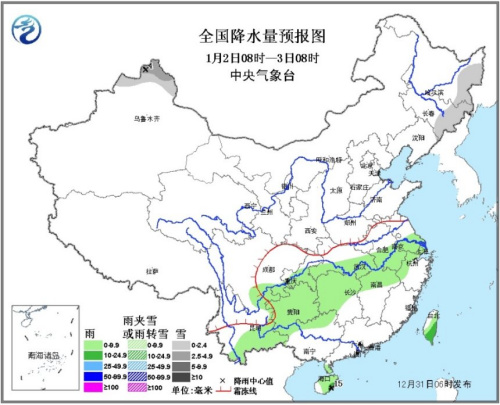 1月2日08时至3日08时,新疆北部、东北地区东部等地的部分地区有小到中雪;四川南部、重庆东南部、云南南部、贵州、江汉南部、江淮南部、江南北部、广西北部、海南岛及台湾等地有小到中雨。