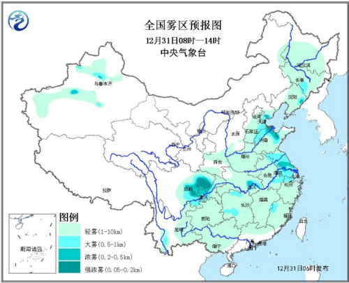 此外,今天早晨至上午,四川盆地中西部、天津东部、河北东南部、山东北部、江苏大部、上海、湖北东部等地有大雾,其中,部分地区有能见度低于500米的浓雾,局部有能见度不足200米的强浓雾。中央气象台12月31日06时发布大雾预报。