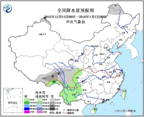 12月31日08时至1月1日08时, 新疆西北部、内蒙古东北部、黑龙江西北部、西藏东部、川西高原大部等地有小到中雪或雨夹雪,其中,西藏东北部局地有大雪;四川盆地西部、云南、贵州西部、海南东部等地有小雨或阵雨。台湾海峡、南海东北部和中部等海域将有7~8级、阵风9级的东北风。