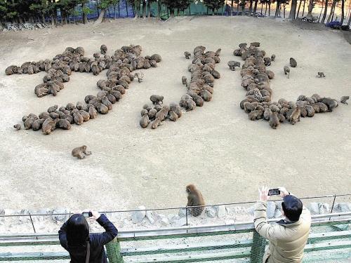 据报道,为打造出这一效果,园内工作人员用猴子爱吃的食物摆出了日语中“猴”的字样,此举引得两百多只猴子纷纷围拢过来,没多久就拼出一个巨大的“猴”字。