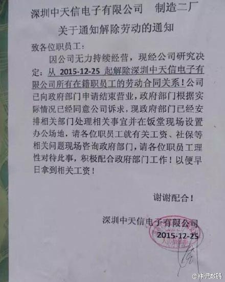 12月25日,深圳中天信电子有限公司制造二厂发了一份《关于通知解除劳动的通知》宣布公司倒闭。