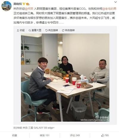 高晓松12月29日下午发布微博称:热烈欢迎@何炅 入职阿里音乐集团,担任首席内容官CCO。与我和宋柯正式组成铁三角。同时极大提高了阿里音乐集团管理层的颜值。我们热诚欢迎更多怀有音乐与娱乐梦想的朋友加入阿里音乐,携手创造未来。大风起兮云飞扬,威加海内兮归故乡,安得猛士兮守四方……