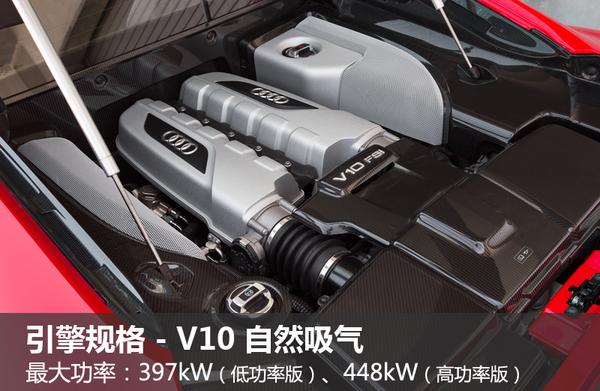 在动力总成中,奥迪全新第二代R8 Spyder将搭载一款V10引擎,虽然这款10汽缸引擎仅采用自然吸气的进气方式,但高转速引擎的设计则能为车辆提供更为强劲的动力输出。全新V10引擎在全力做功时,能够爆发出397kW的最大功率,而高功率版引擎则能将引擎的最大功率推升至448kW,助其在3.2秒的时间内完成百公里加速。而在传动系统中,奥迪第二代R8 Spyder有望搭载一台7速双离合变速箱,进而将V10引擎的动力高效传递至驱动轮。