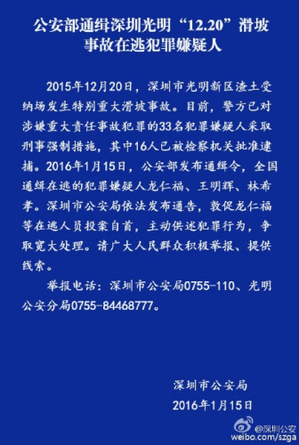 中新网1月15日电 据深圳市公安局官方微博消息,2015年12月20日,深圳市光明新区渣土受纳场发生特别重大滑坡事故。目前警方已对涉嫌重大责任事故犯罪的33名犯罪嫌疑人采取刑事强制措施,其中16人批准逮捕。