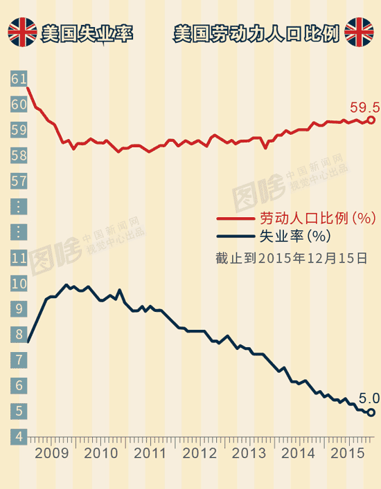 尽管失业率逐年下降,但是美国真正拥有工作的人并没有增多。由于退休、残疾等等原因,美国劳动力人口所占比例在下降。