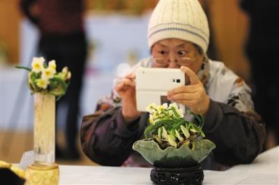 昨日,一位市民正在中国插花艺术博物馆欣赏年宵花,拍摄水仙花盆栽。春节渐近,“年宵花”市场逐渐升温。新京报记者 薛珺 摄