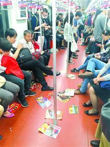 地铁车厢内满地花花绿绿的小广告。 资料照片