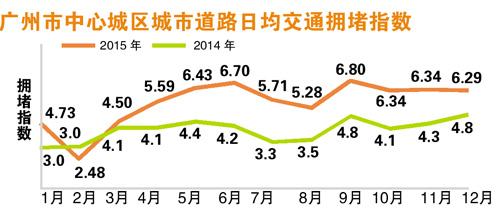 “交通拥堵年历”首次披露了广州1015年全年日均拥堵指数。2015年,广州市中心城区城市道路日均交通拥堵指数为5.57(轻度拥堵),比2014年上升39%,中心城区交通拥堵明显加剧。