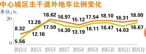 根据2015年5月~12月份每月对中心城区15条主干道的断面交通量和外地车占比情况的常态化人工调查结果,调查时间分为平峰(15:00~16:00)和高峰(17:30~18:30)。从上图可以看出,5月份过后中心城区主干道的外地车占比情况一直处于高位水平。除了暑假期间,晚高峰的外地车占比基本都在16%以上,远高于2013年年底的水平。平峰时期的外地车比例相对更高,且外地车占比变化态势与拥堵指数变化趋势基本吻合。(见上图)