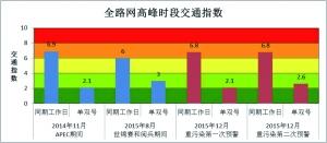 2014年APEC、2015年世锦赛和12月份2次空气重污染红色预警单双号行驶期间的监测数据显示,全路网工作日早晚高峰平均交通指数在3左右,也就是基本畅通,与单双号行驶前后工作日早晚高峰平均交通指数在6,也就是中度拥堵以上相比,单双号行驶期间交通指数降幅在50%左右。
