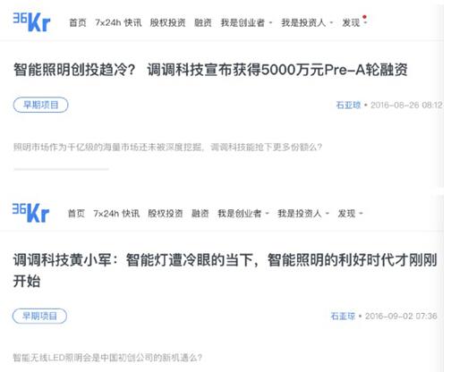 2015年,调调科技获得2250万元天使轮融资,投资人为云锋基金虞锋、唯品会投资人吴彬、德展金投张勇和柯罗尼资本刘燊。同年7月,调调科技与照明领域的科研领头羊浙江大学光学实验室合作研发了 RGBW 四色 Q-Gamut LED 彩色混光算法。据介绍,这是一种业内领先的特征化算法,可以精准复现每一种色温,并且可以根据不同应用场所的需求,调节选择高亮度模式或者高显色模式。