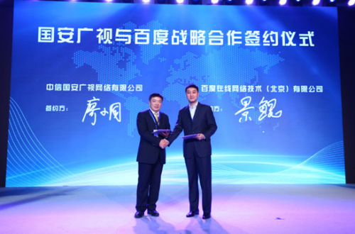 (百度度秘总经理景鲲与中信国安广视总经理廖小同现场签约)
