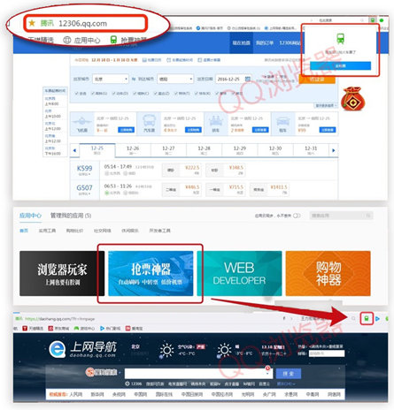 需要购票的用户可使用电脑版QQ浏览器打开网址12306.qq.com或在应用中心安装抢票插件、点击右上角绿色火车头即可开始抢票。