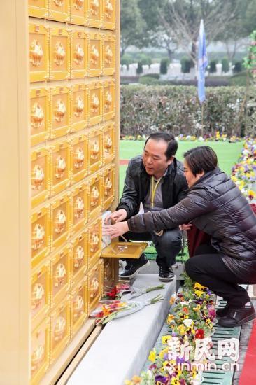 图说:首批落葬的11户家庭在墓葬墙祭奠亲人。庄毅 摄