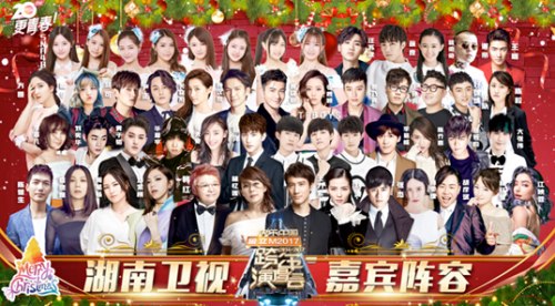 目前公布的明星阵容显示,林忆莲、韩红、王力宏、张杰、黄晓明、钟汉良、李易峰、张若昀、尹正、贾乃亮、黄子韬、陈乔恩、张天爱、大张伟、TFBOYS、SNH48、刘宪华、刘涛、华晨宇、蔡健雅、杨钰莹、周笔畅、张靓颖、尚雯婕、陈楚生、王铮亮、邓紫棋、胡彦斌、关晓彤、陈粒、好妹妹、徐良、汪苏泷、王晰、谢帝、马可、蒋依依、江映蓉、李菲儿、圈9、方圆、夏日甜心等,众多明星大咖将在2017湖南卫视跨年演唱会上带来精彩表演。