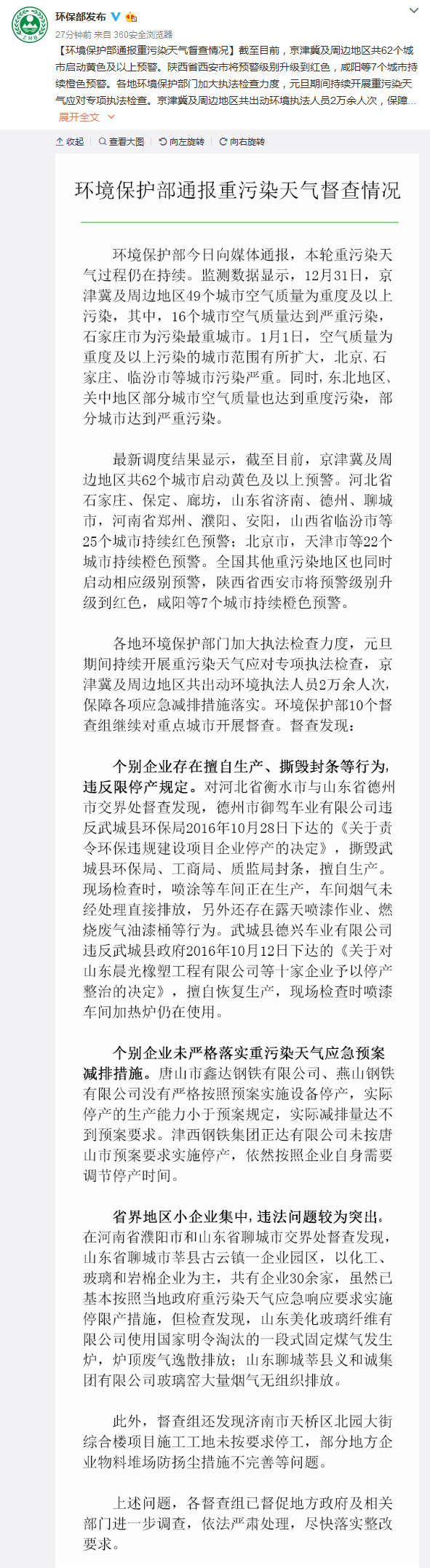 各地环境保护部门加大执法检查力度,元旦期间持续开展重污染天气应对专项执法检查。京津冀及周边地区共出动环境执法人员2万余人次,保障各项应急减排措施落实。