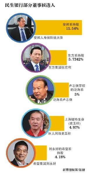 与上一届相同的是,民生银行董事会依然是9位股东董事、3位执行董事和6位独立董事的格局。在9位股东董事候选人名单中,除了老股东东方集团张宏伟、泛海系卢志强、希望集团刘永好、巨人网络史玉柱、安邦人寿保险姚大锋、福信集团吴迪外,还有3位新成员:宋春风、田志平、翁振杰。