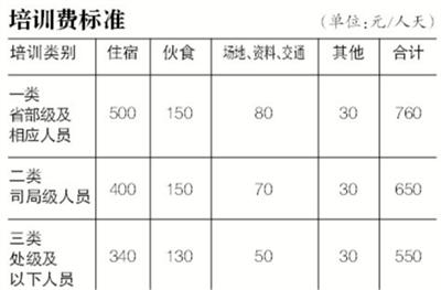 据了解,2013年印发的《中央和国家机关培训费管理办法》中曾规定,培训费为单一标准,其中住宿费180元/人天,伙食费110元/人天,场地费和讲课费100元/人天,资料费、交通费和其他费用60元/人天,合计450元/人天。