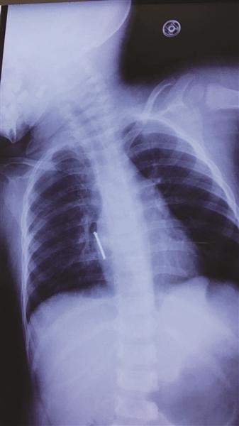 胸片显示,气钉扎进孩子胸腔,差一点就要了孩子的命。